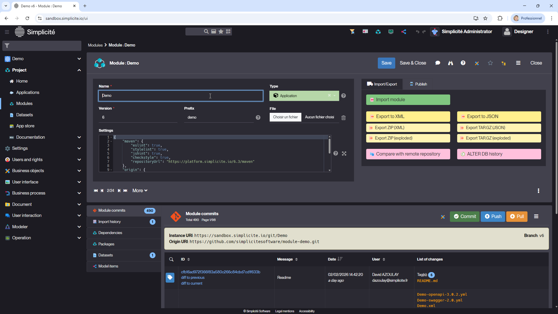 Sur un environnement intialisé avec une image 6.3, je n’ai pas d’onglet Module commits visible sur mes modules (que ce soit mon projet ou par exemple Demo)