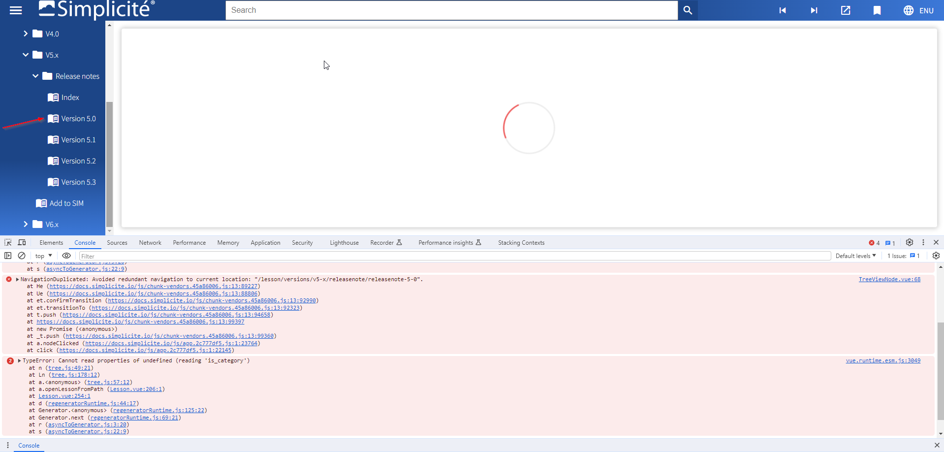 J’aimerai consulter les releases notes de Simplicité notamment la partie “breaking changes” mais quand j’essaye d’y accéder la page ne s’affiche pas et des erreurs sont présentes dans les logs navigateurs.