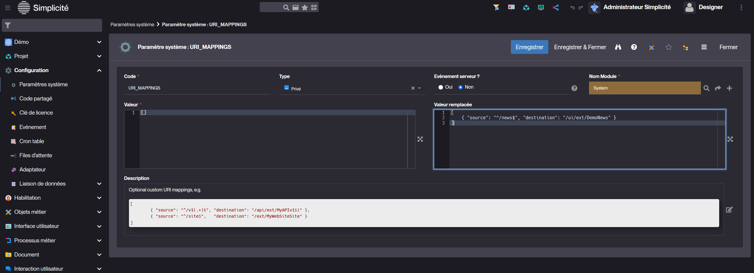 [Firefox] Modifier le paramétrage du paramètre système URI_MAPPINGS pour mettre cette valeur dans valeur remplacée :