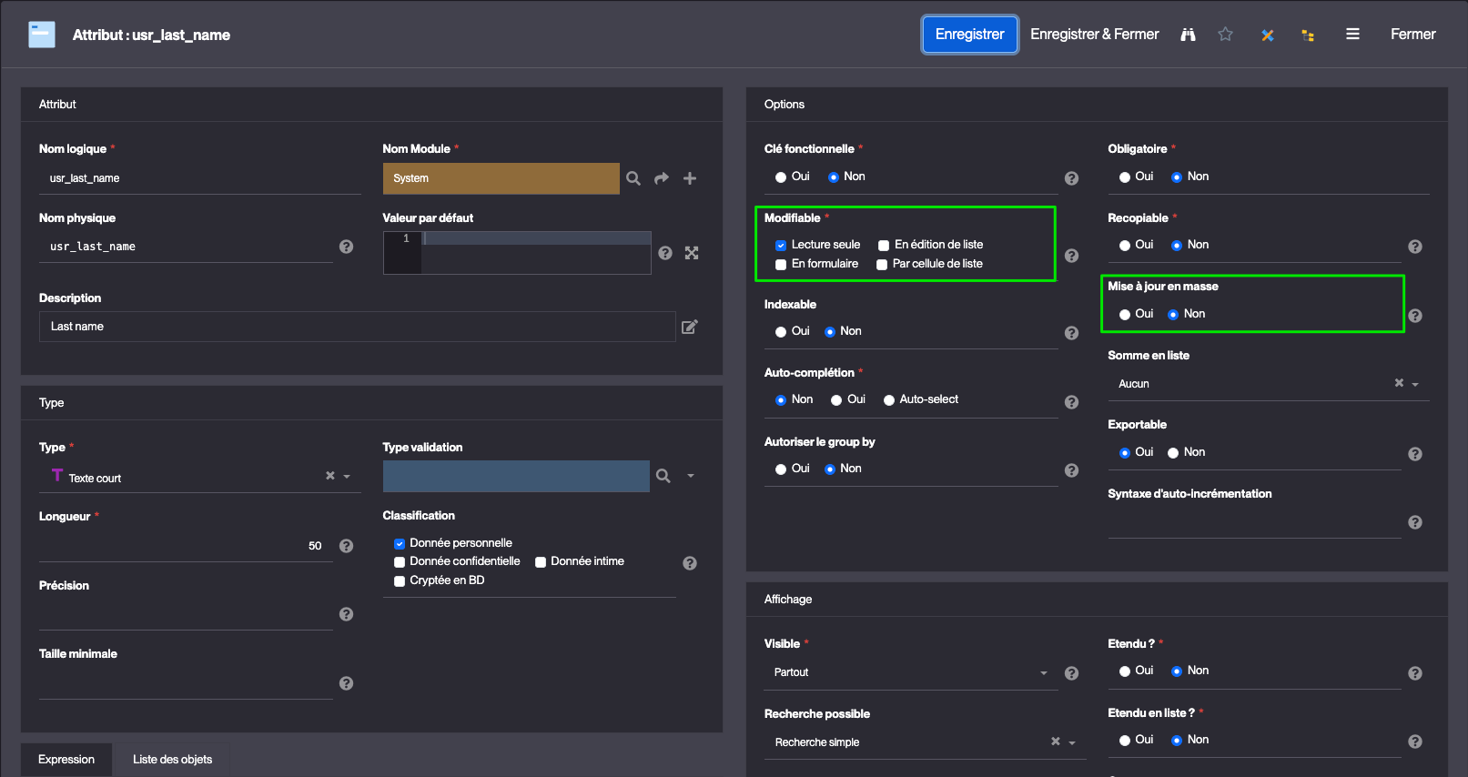 Par exemple, mon objet principal “Campagne” possède des attributs non modifiables (et paramétrés “Mise à jour en masse” sur “Non”).