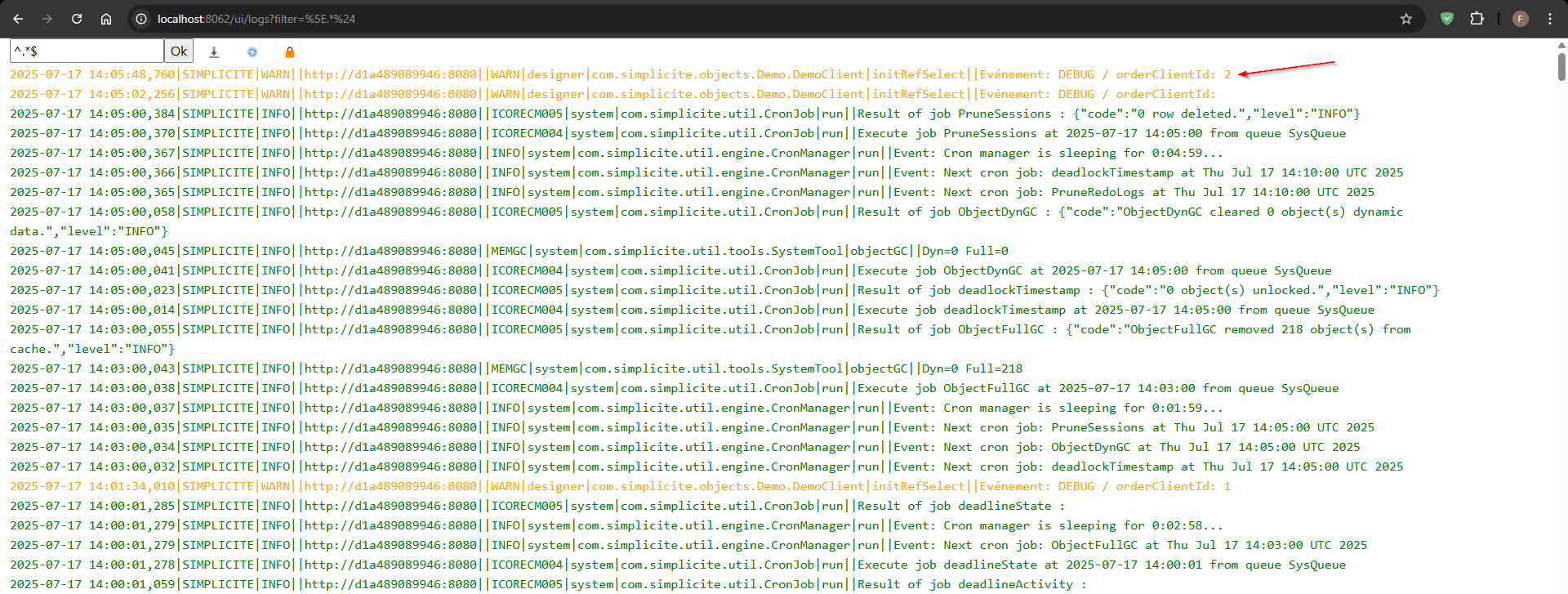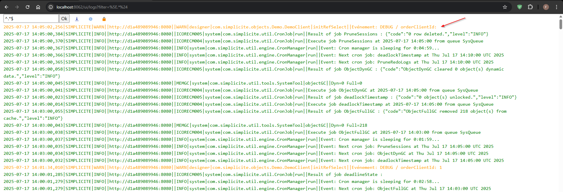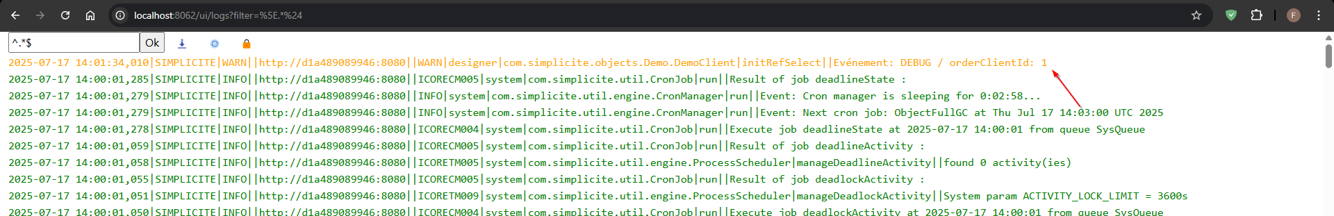 - Dans les logs on peut voir qu’on a orderCLientId qui vaut 1 ce qui correspond bien au row_id de notre client sur la commande 1 où on se trouve.