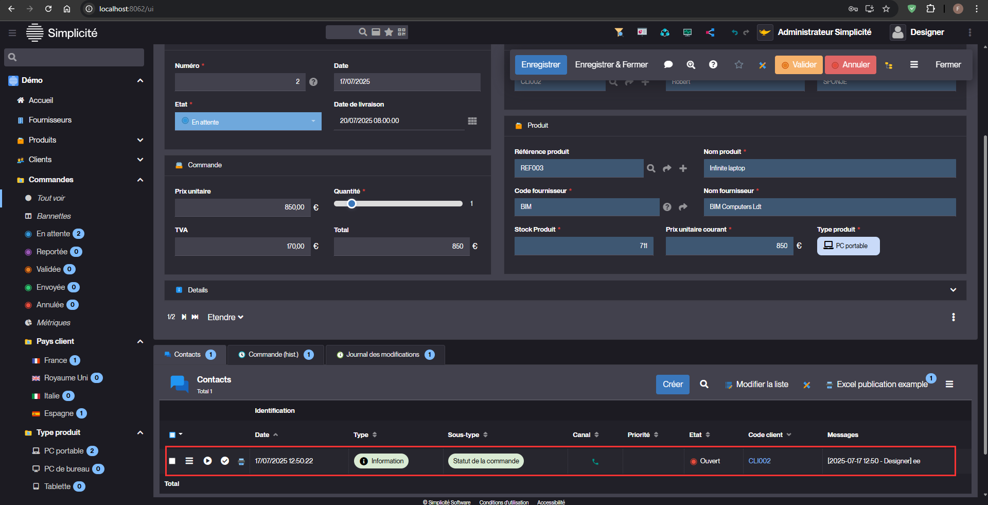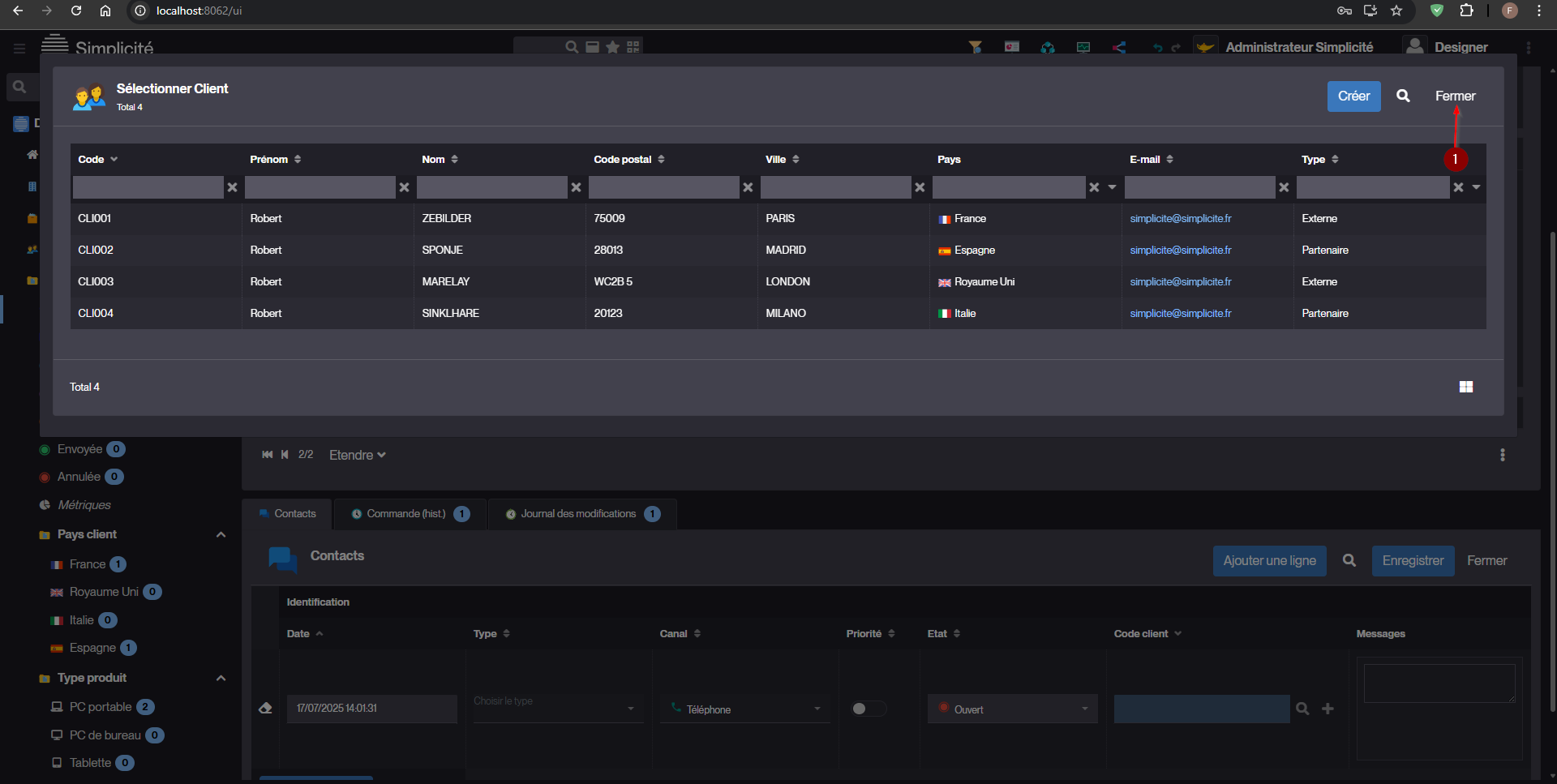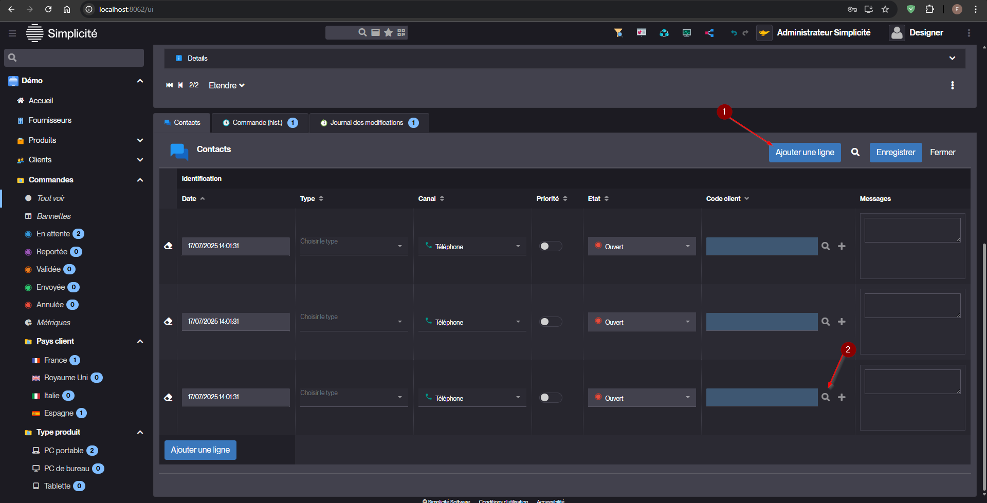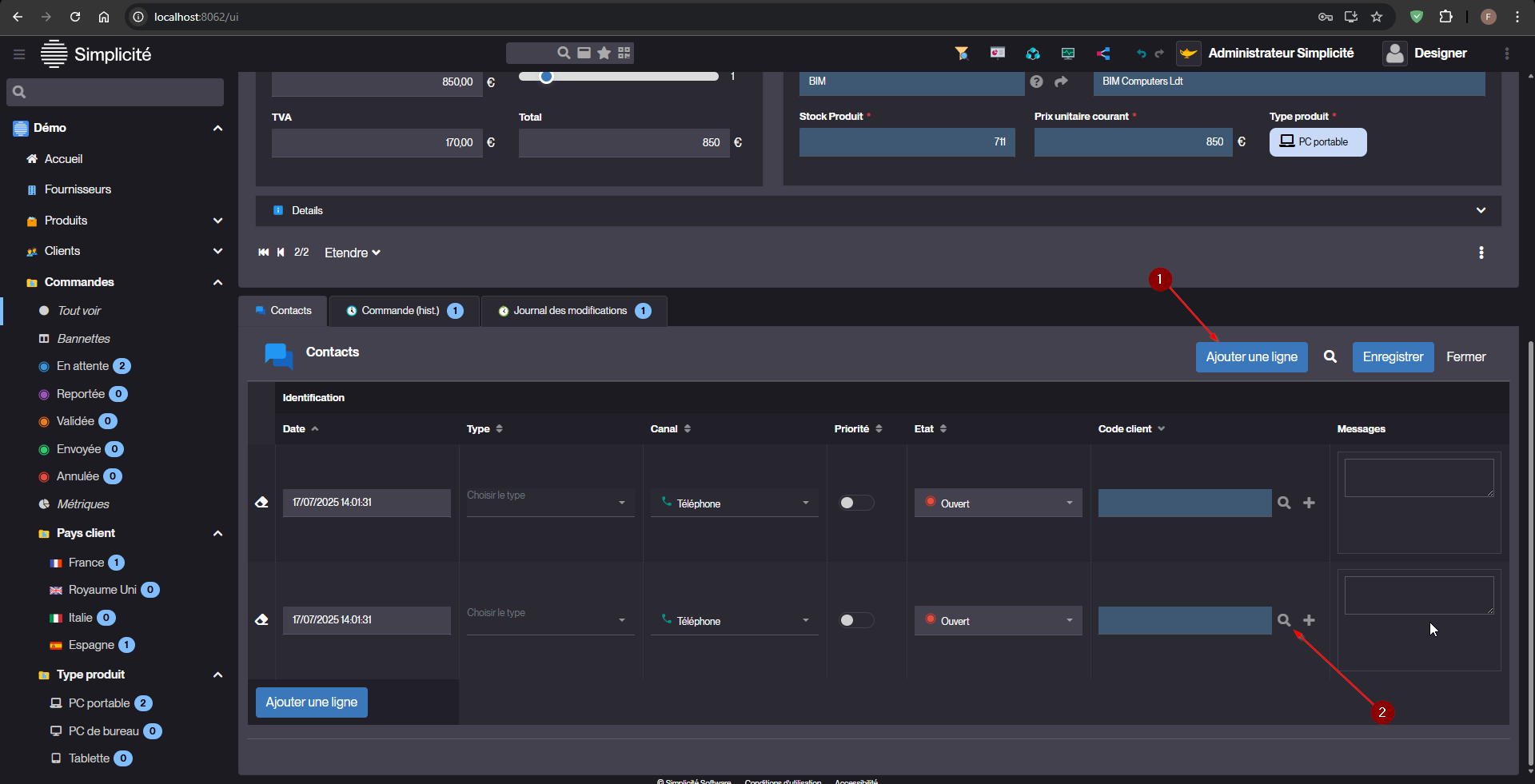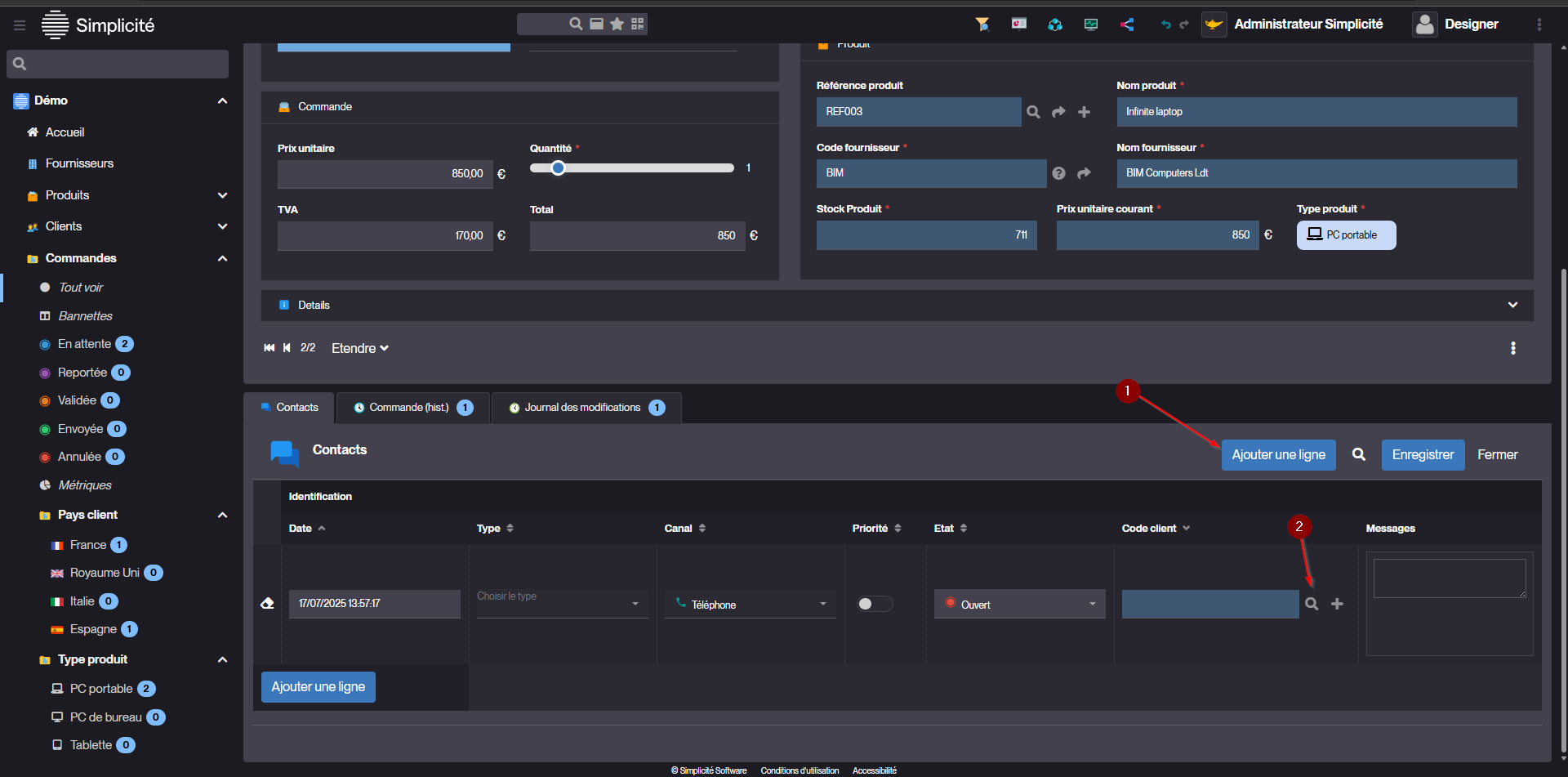 - Au niveau de la commande n°2, créer un contact en prenant client 2.