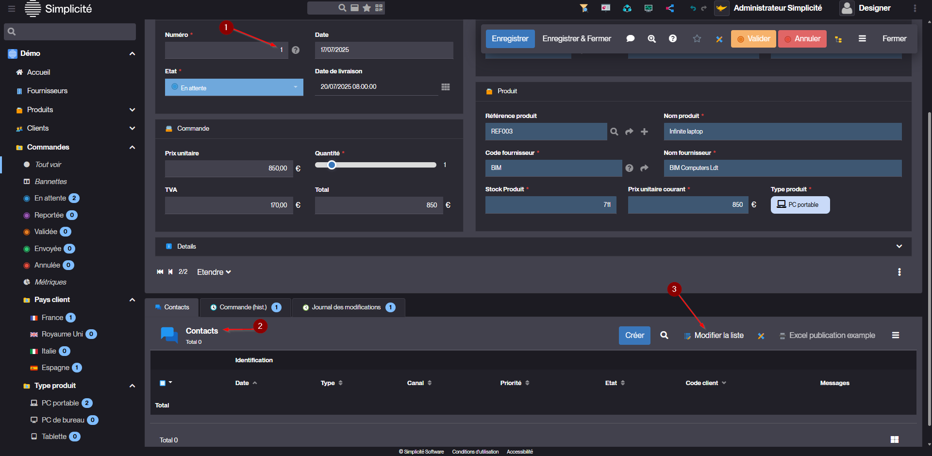 - Ouvrir la commande n°1. Créer un contact en passant par “Modifier la liste”.