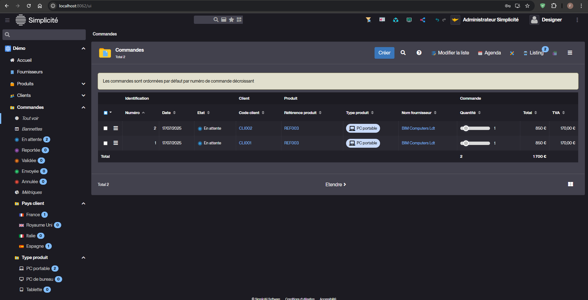 - Créer deux commandes. Commande 1 client 1 et commande 2 client 2.