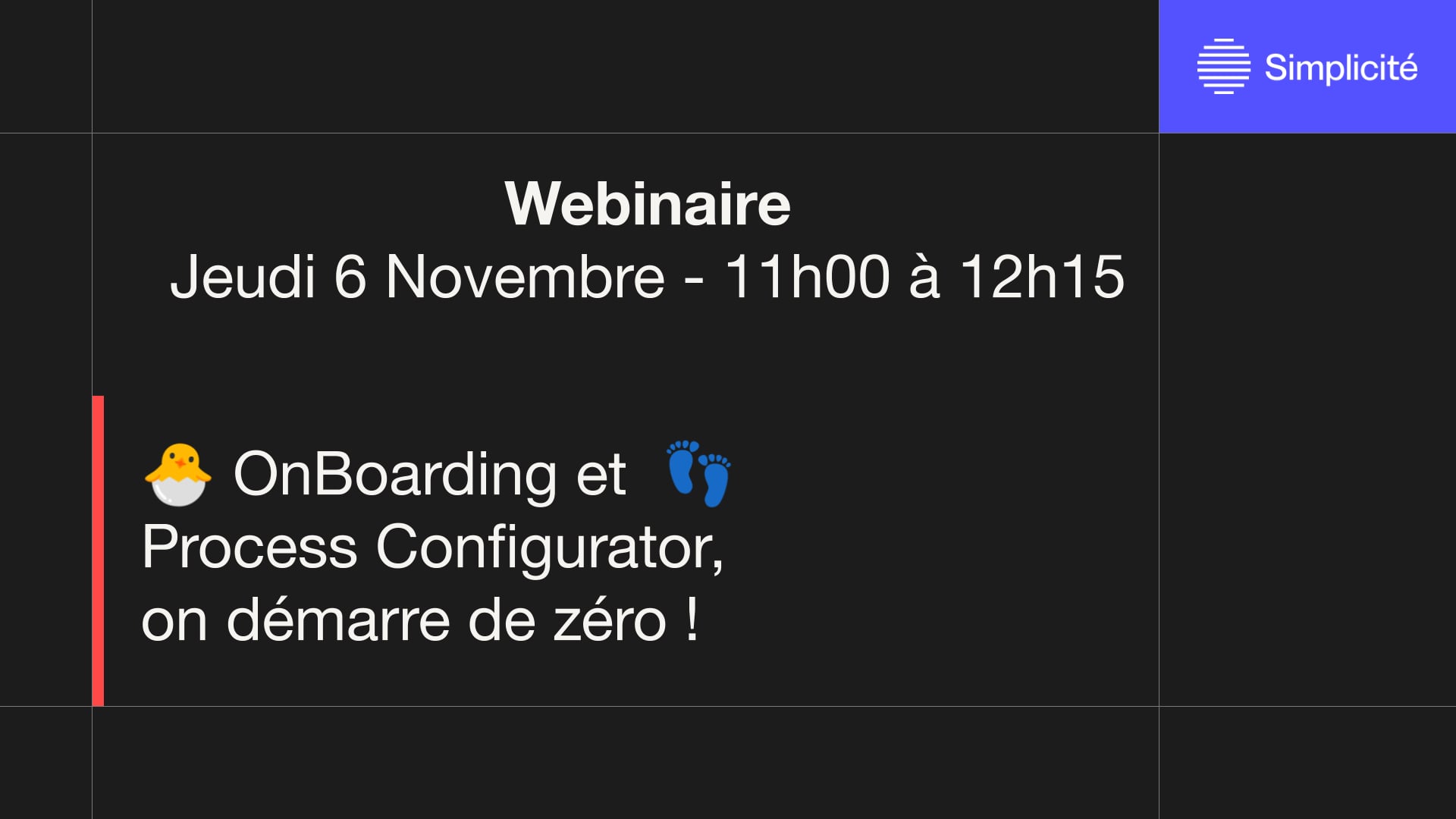 Rejoignez-nous pour un atelier pratique et interactif oĂč nous construirons from scratch un guide OnBoarding SimplicitĂ© ainsi que lâintĂ©gralitĂ© du Process Configurator.