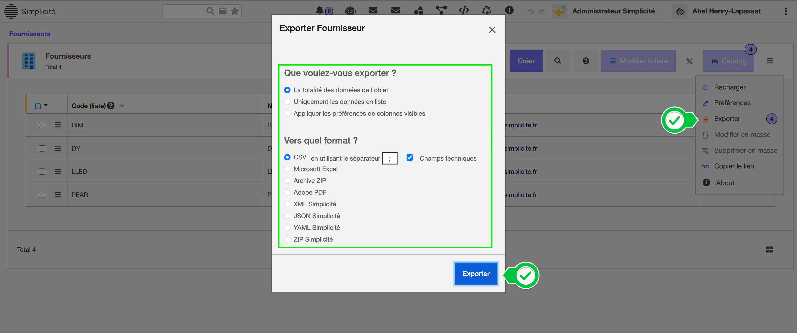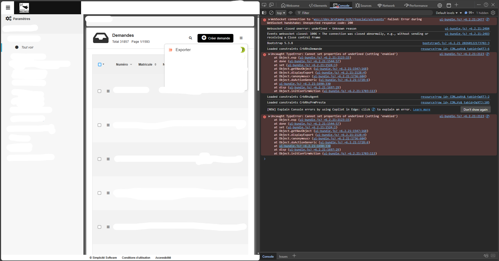 Concernant la fonctionnalité d’Export en tant que telle, nous utilisons le comportement natif de Simplicité (bouton standard, aucun code spécifique surchargé pour l’action d’export elle-même). C’est pourquoi je suis surpris que cela génère une erreur JavaScript côté client (Uncaught TypeError...).