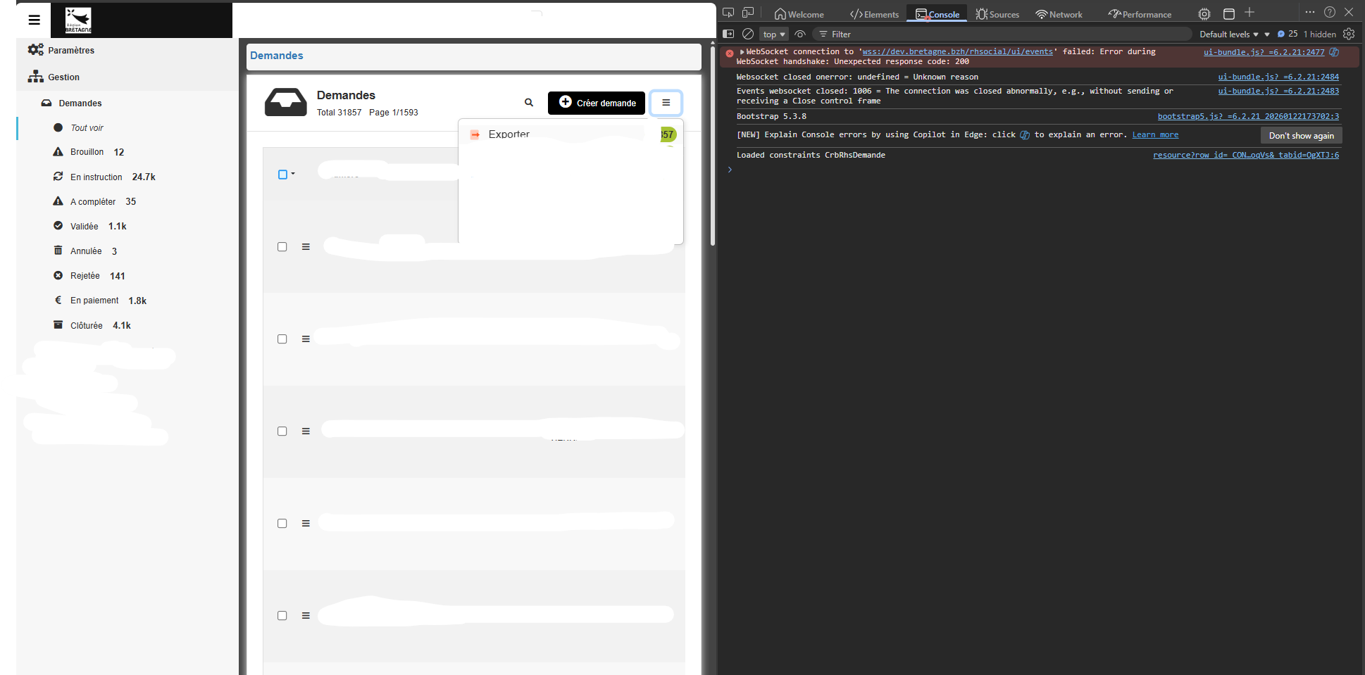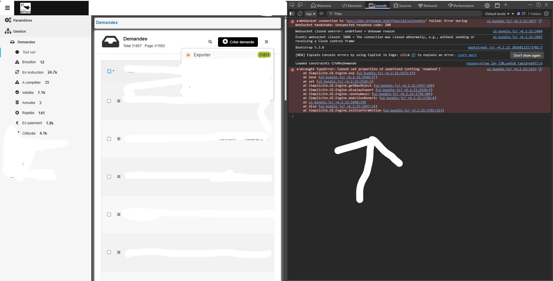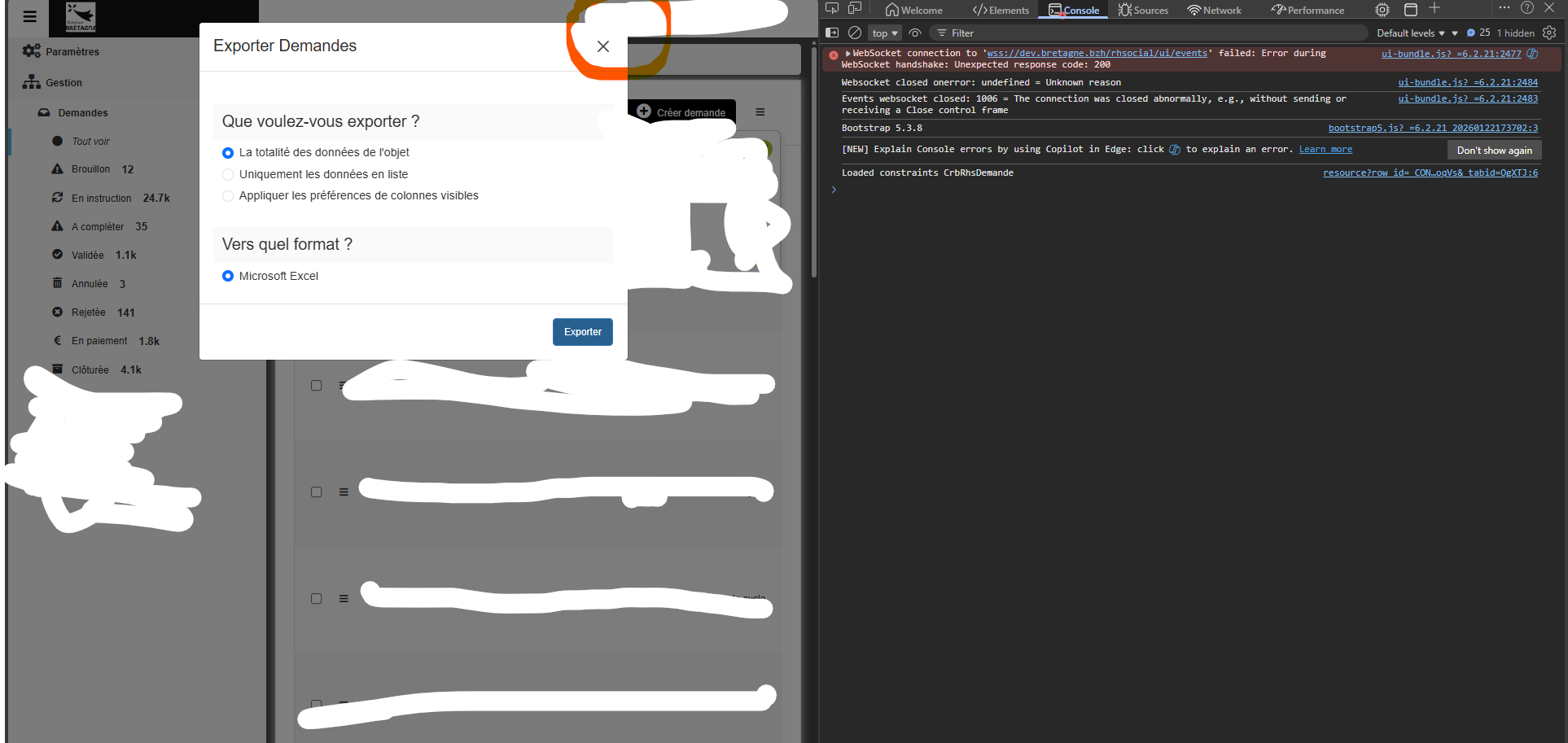Une hypothèse serait que l’un des modes (CSV, XLS, PDF, ARC, XML, JSON, YAML, ZIP) est supprimé lors du second clic, et donc entraîne une erreur lors de la vérification de son *.enabled, la solution se trouve sûrement dans le code front de votre objet Demande (ou tout autre code qui viendrait potentiellement modifier cet objet), dans lequel vous devez d’une manière ou d’une autre modifier les valeurs, si vous avez des doutes et qu’il vous est possible de m’envoyer ce code je vous aiderai à debugger cela.