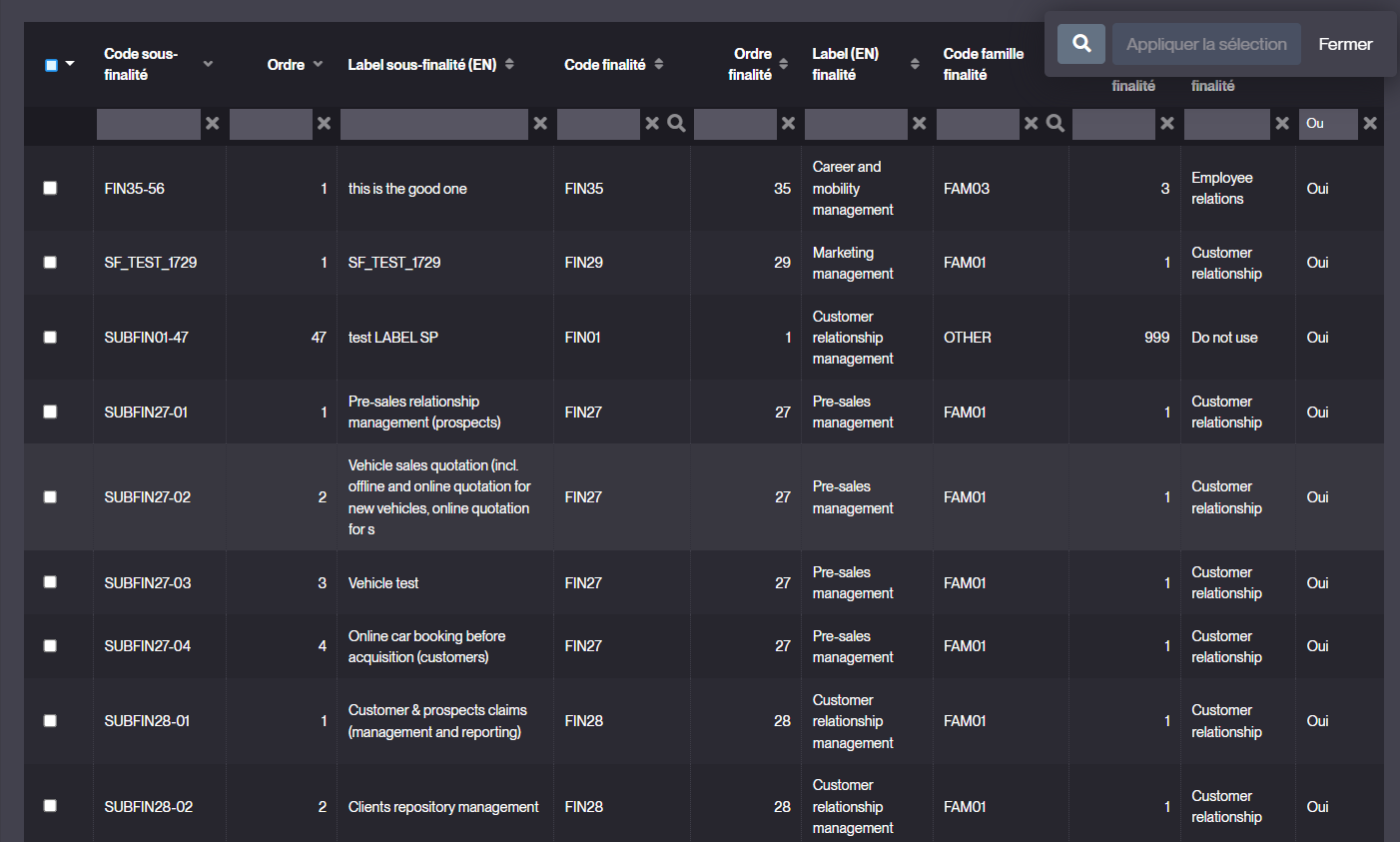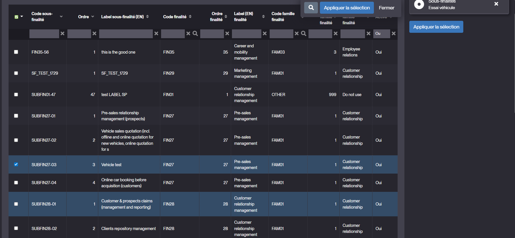 la liste s’ouvre avec les sous-finalités déjà associées pré-cochées