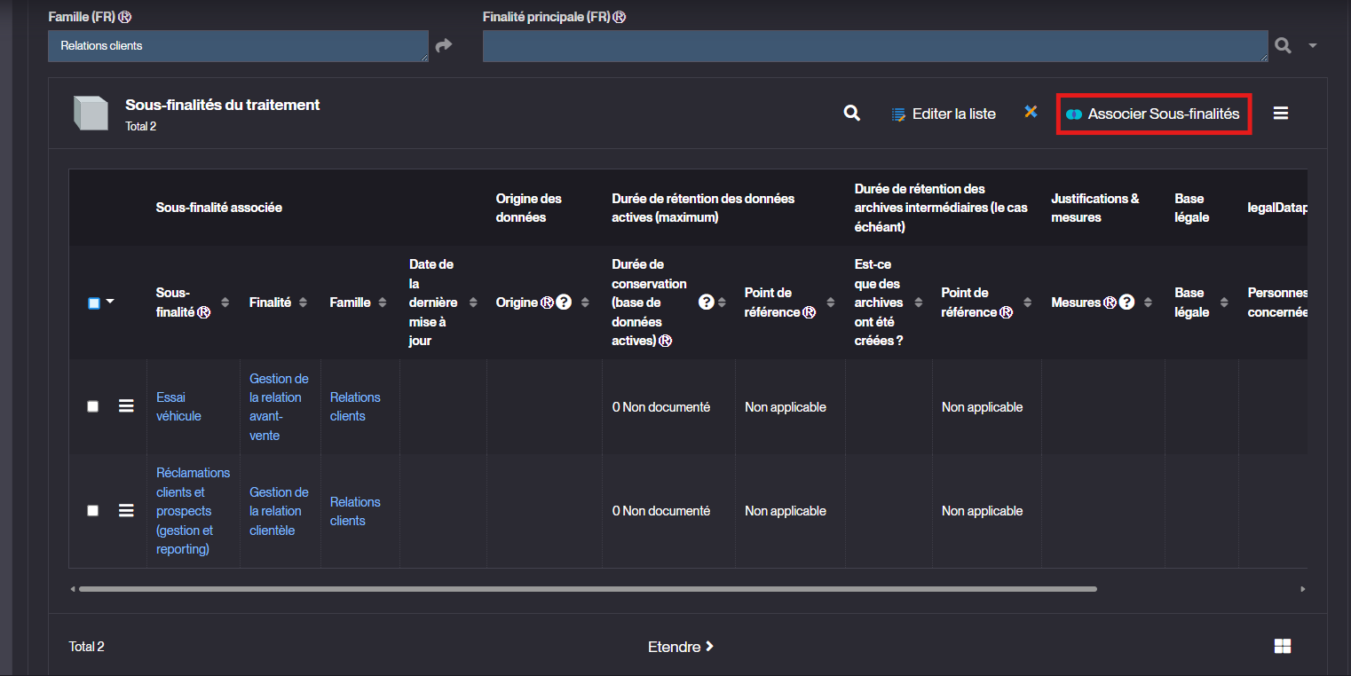 legalDataprocessSubPurpose - Association réalisée via le bouton standard « Associer Sous-finalités »
