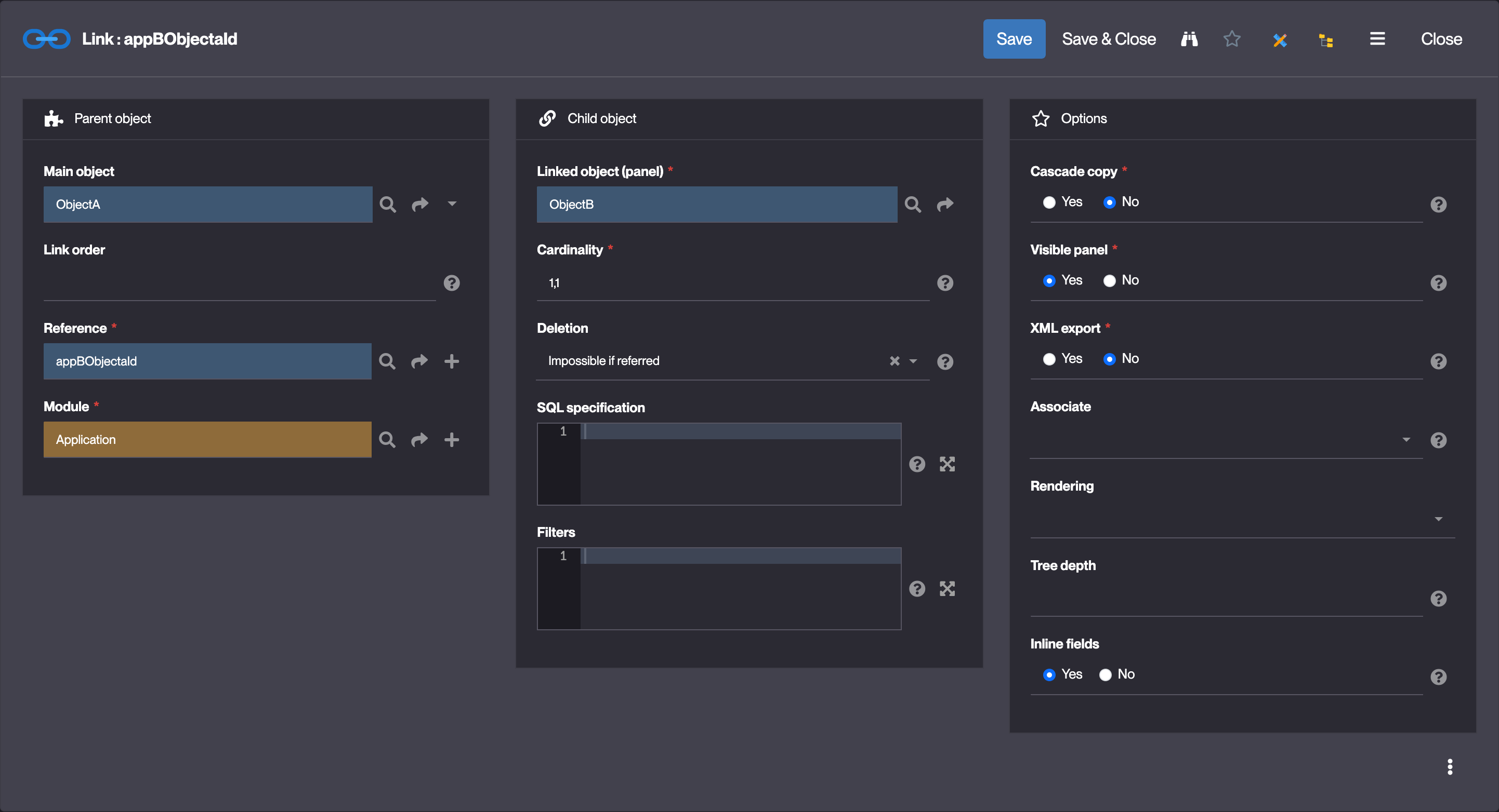 Avoir un objet A avec un lien inliné vers un objet B