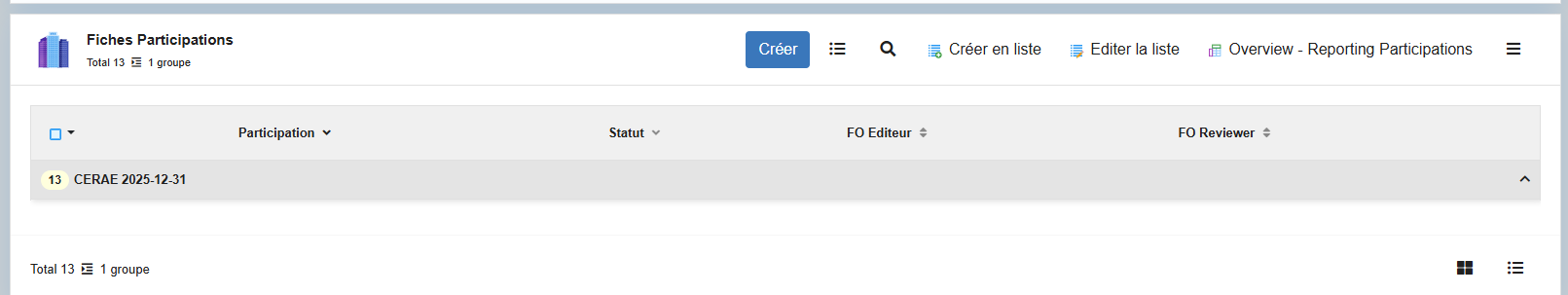 Pour un Reporting donné, la liste liée « Fiches Participations » doit afficher toutes les Reporting Participation associées. Dans le cas joint, nous devrions voir 13 enregistrements.