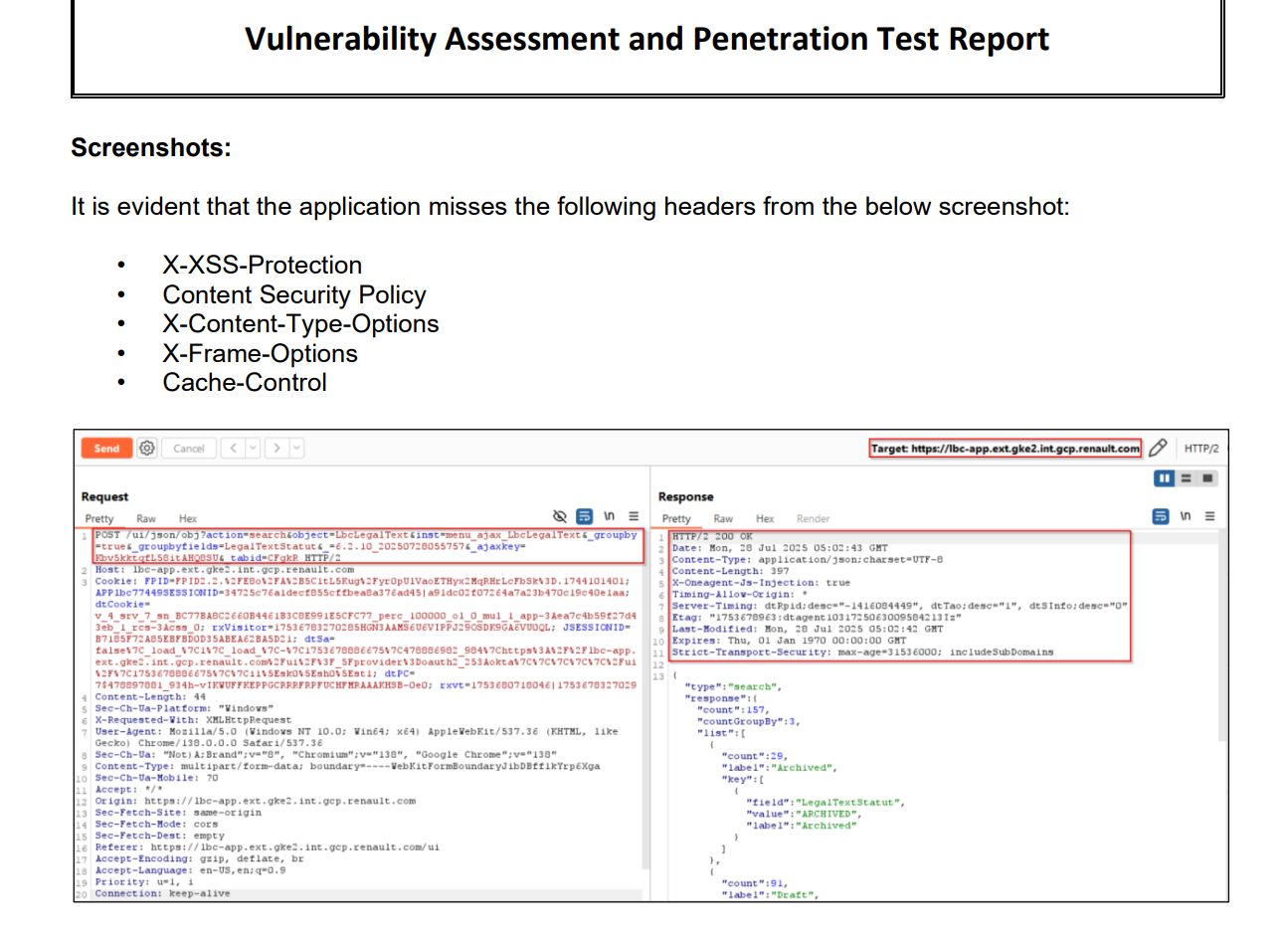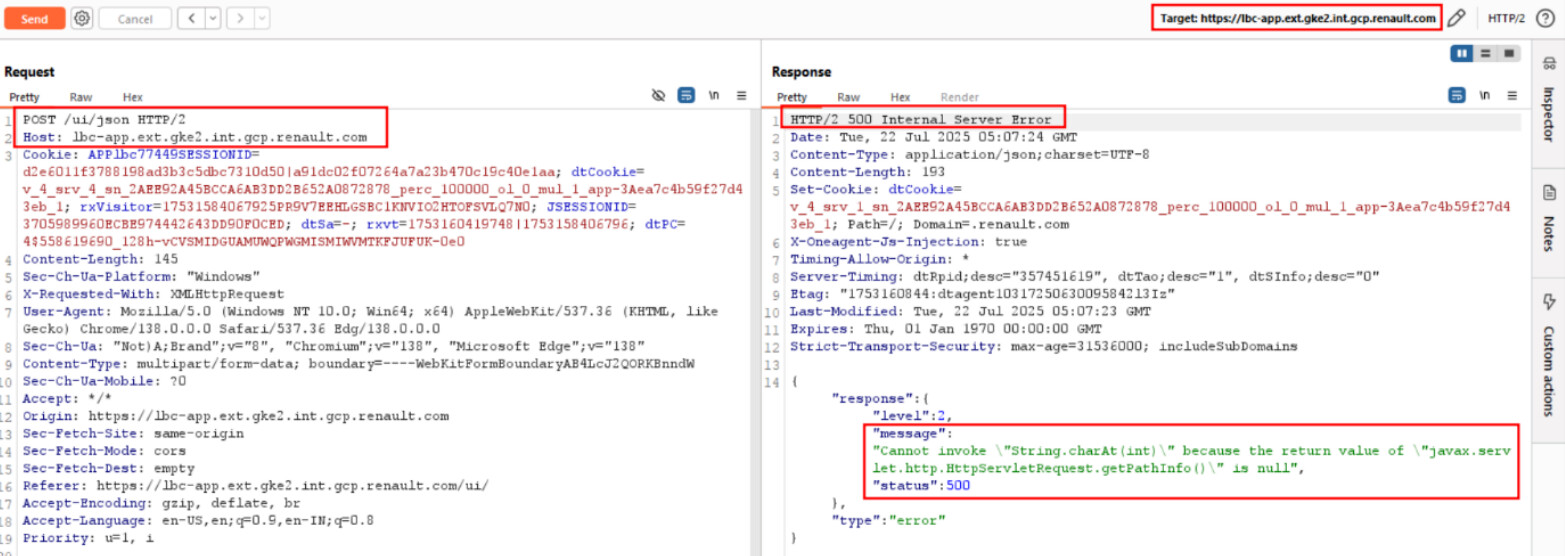 Ce comportement expose des détails internes de la stack Java, ce qui peut être considéré comme une fuite d’information technique selon les standards OWASP.En altérant une requête, la plateforme répond HTTP 500 avec un message Java.